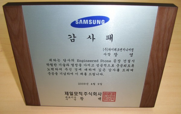 당사는 제일모직(여수공장) Engineered Stone 공장 건설에 탁월한 기술과 열정을 가지고 성공적으로 준공하여  감사패를 수상하였다.