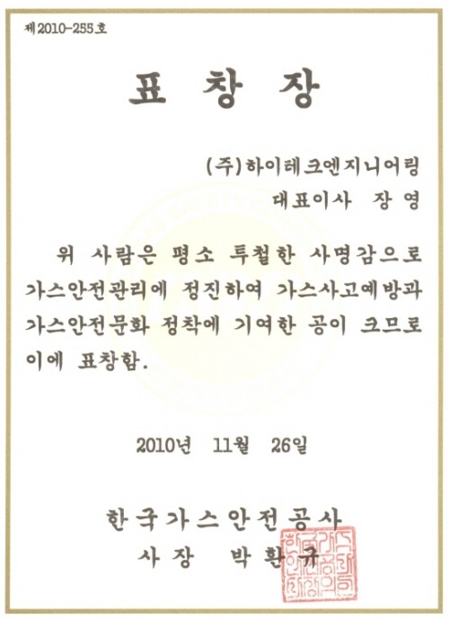 We received a citation from Korea Gas Safety Corporation for contributing to the