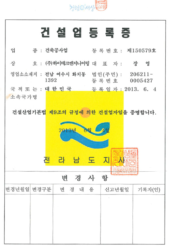 Our company registered a building construction business license in Jeollanam-do on June 04, 2013.