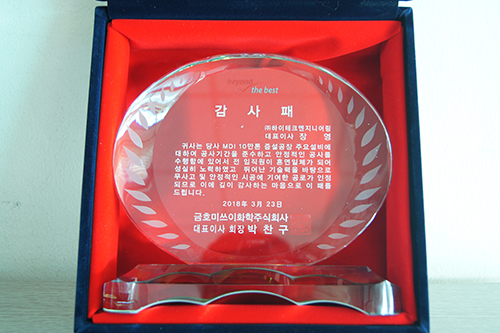 Received a plaque of appreciation from Kumho Mitsui Chemicals