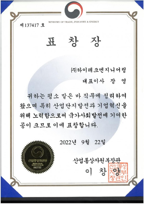 the first industrial complex in Korea, the CEO of Hi-Tech Engineering was awarded the Minister of Trade,