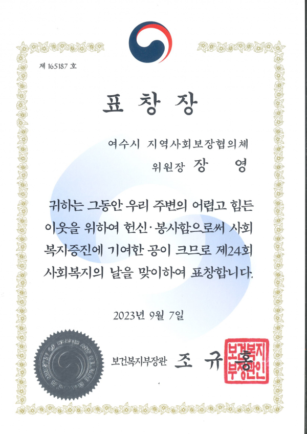 In commemoration of the 24th Social Welfare Day, Jang Young, chairman of the Yeosu City Community Security Council,