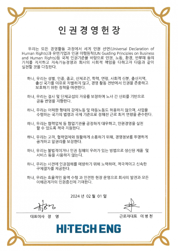 Hi-Tech Engineering has declared the Human Rights Management Charter as follows in order to raise awareness and standards for human rights and fulfill sustainable management and the company's social responsibilities.