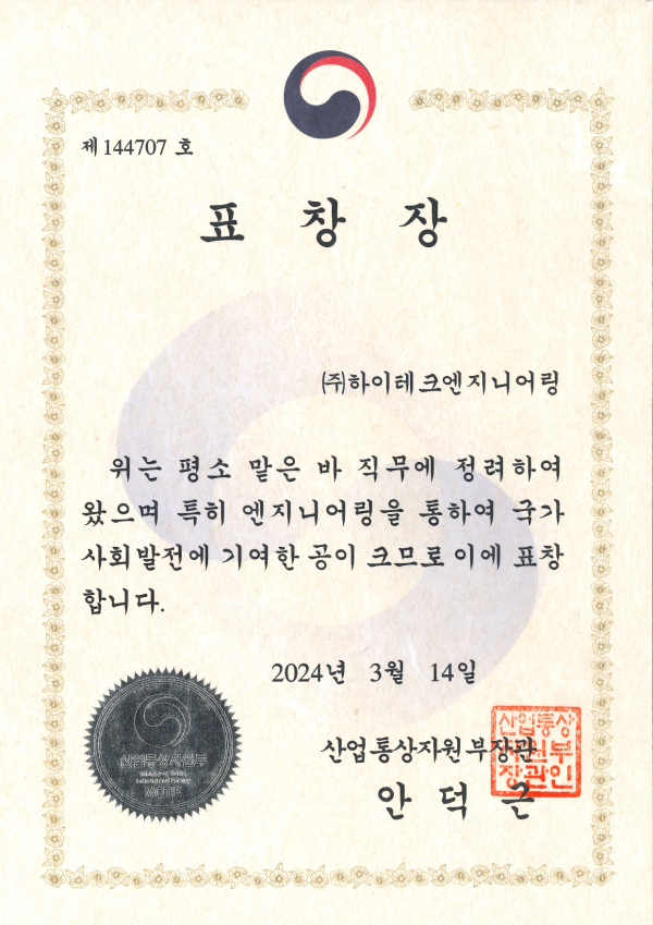 Hi-Tech Engineering received a commendation from the Minister of Trade, Industry and Energy