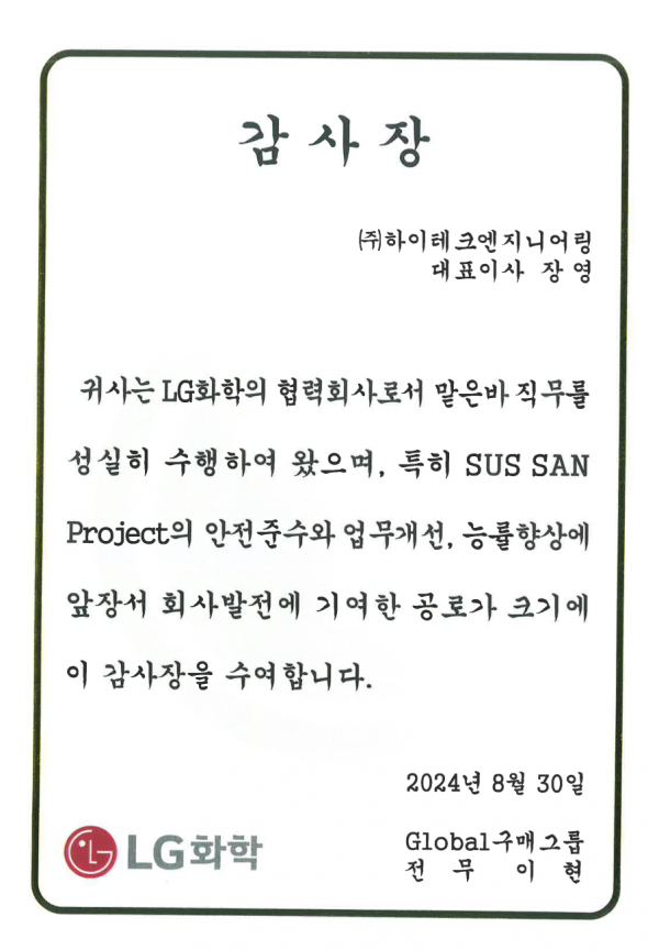 On August 30, 2024, we received a certificate of appreciation from LG Chem for our contribution to company development
